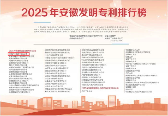 在春节后首个工作日,“技术奇瑞”便用一份沉甸甸的成绩单诠释了何为“创新领跑”。在由安徽省多部门联合发布的“2025年安徽发明专利排行榜”上,奇瑞汽车股份有限公司再次毫无悬念地摘得桂冠,实现了连续12年霸榜的壮举。这一“十二连冠”的背后,是专利数量的累积是奇瑞长期坚持“技术立企”战略、将核心竞争力深植于自主研发土壤的生动写照,彰显了其在安徽乃至全国汽车产业中持续迸发的蓬勃后劲。 发明专利向来被视为企业核心竞争力的“硬名片”,更是推动高质量发展的“动力源”。奇瑞之所以能在这片竞争激烈的红海中始终立于潮头,源于其对技术创新与知识产权工作近乎执着的重视。作为首批国家知识产权示范企业之一,奇瑞不仅在知识产权体系建设与成果转化方面持续走在行业前列,更先后承担了国家“863计划”、重点研发计划等百余项重点项目。这些努力换来了丰硕的回报:多次斩获“国家科技进步一、二等奖”,获评国家级“创新型企业”,并荣获“中国汽车知识产权优秀企业奖”及“国家知识产权局专利转化运用优秀案例”等重要荣誉。