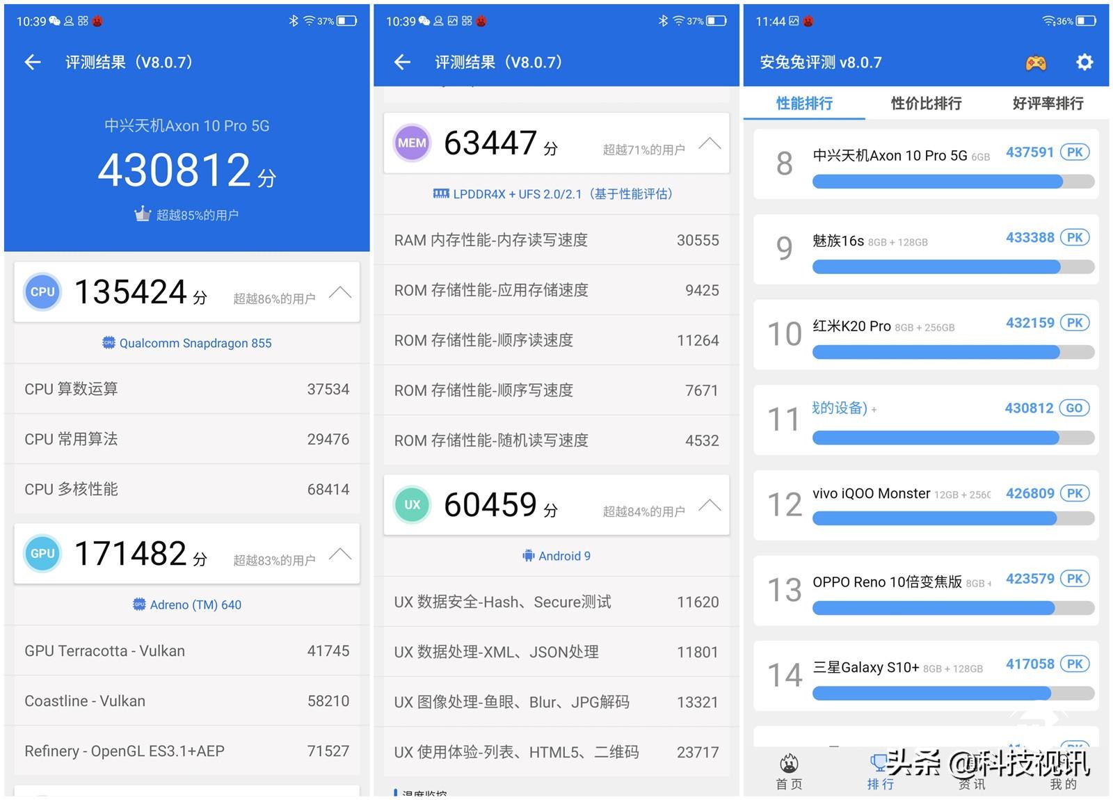 2019年下半年各大手机厂商联合运营商,分别将旗下5G智能手机推至消费者面前,5G智能手机商用化正式走上正轨。中兴作为全球领先的综合通信解决方案提供商,中国最大的通信设备上市公司之一,率先带来了第一部商用5G智能手机——中兴Axon 10 Pro 5G,作为一款5G商用智能手机,扮演着5G先锋角色,抢先占领5G智能手机市场,带来5G高速上网体验。如今已来到科技视讯评测室,接下来就去其进行全面体验测评。 八曲面水滴屏握持极致舒爽 与市面上其它的全面屏手机有所不同,中兴Axon 10 Pro 5G机身正面搭载了一块6.47英寸柔性3D曲面水滴屏,曲面式设计视觉美观度提升了不少,机身的边框更是营造出若隐若现的虚拟感,而其搭载的2340*1080的屏幕分辩率以及AMOLED屏幕材质,更是为日常带来了更为鲜艳、色彩丰富的屏幕视觉效果。 屏幕指纹解锁作为目前高端旗舰机的标配,中兴Axon 10 Pro 5G同样搭载了此项功能,位于机身屏幕下方,采用的新一代光学指纹识别模组,优化了强光、湿手等复杂情况下的指纹解锁情况,可做到0.272秒亮屏下快速解锁,感受更快的指纹解锁体验。 另外机身的前后两面均采用深弯3D柔性曲面设计,带来了更为纤薄的机身既视感,而且曲线的设计更容易与手掌相贴合,上手可感受到极为舒适的握持手感,而玻璃材质的采用在握持时更是带来更为细腻的贴肤感,纤薄、舒适就是上手的第一感觉,手感舒适度远远不是市面上其它手机所媲比。采用的康宁大猩猩玻璃材质,可有效减小日常跌落碎屏、划痕等情况的发生。 在摄像头摆放方面,中兴Axon 10 Pro 5G机身背面搭载的是以4800万像素主摄为主三摄像模组,采用双跑道般曲线方式摆放在机身背面左侧上方,同时背面超广角摄像头采用隐藏式无孔设计,美感度有所提升。而宝石蓝色的配色更显出一种高端气质感,在光线下呈现丰润色泽,高级感扑面而来。 纵观市面上其它5G智能手机,无一款手机不是厚重的机型,主要是由于5G相比4G手机会带来更多的功耗,此时需要更大电池提供持久续航支撑,而且部分手机的5G基带采用外挂的形式,这些都无形之中增加了5G手机的厚度与重量。 而中兴Axon 10 Pro 5G依旧保留了纤薄的设计,机身三围尺寸为159.2*73.4*7.9mm,重量仅为175g,但是却依旧搭载了4000mAh大电池,对于机身主板的构造,内部元器件的摆放及设计更为考究,而中兴老品牌的深厚研发工艺,无疑在此刻得以彰显。 另外在机身的背面左侧下方烫印这AXON 5G的字样标识,而这也是从外观判断手机是否是5G手机的方法。与4G手机刚上市一样,目前大多数的5G手机在机身外观上都烫印着5G标识,用于与其它4G手机区分开。 高通骁龙855芯片 强悍性能无需多言 想要体验5G的超速网速带来的快感,硬件性能配置上一定要更上步伐。中兴Axon 10 Pro 5G版在芯片上搭载了时下顶尖的高通骁龙855旗舰处理器,采用7nm工艺制程,其中CPU主频高达2.84Ghz,GPU采用Adreno™640 GPU模块,满足大型游戏的3D图形处理能力,配合Snapdragon X50 5G调制解调器释放变革的5G体验,率先体验5G带来的高速体验。 在安兔兔性能跑分中获得430812分,其中CPU获得135424分,GPU获得171482分,代表存储性能(LPDDR4X+UFS 2.0/2.1)的MEM获得63447分,UX获得60459分,在性能排行榜总位于第11名,由此也可见其性能强悍之处。 在鲁大师性能评测中获得409233分,其中CPU获得169927分,GPU获得155201分,RAM(内存)获得36188分,存储性能获得47917,同样都获得较高的评价,位于性能排行中第8位。 在鲁大师的系统体验评测中获得155.07分,所有机型中排名第3,系统体验极为畅快。在HTML5评测中获得47375分,得分超过98%的其他手机用户,在AI性能评测中获得47778分,位于所有机型中第10名。 在Geekbench4.0跑分评测中单核获得3465分,多核获得10880分,性能表现非常优秀。在AndroBench5.0评测中顺序读取速度为773.05 MB/s,顺序写入速度为502.76 MB/s,与在鲁大师闪存性能评测中数据大致相同,俨然UFS2.1闪存规格,可带来更为流畅的存储速度体验。 在游戏体验时,中兴Axon 10 Pro 5G系统搭载了游戏助手功能,可通过清理后台进程,限制后台应用自启动,加速CPU运行从而为游戏体验加速,另外还又网络优化、屏蔽通知、禁止自动调节亮度等功能,营造更为舒适的游戏体验环境。 在《王者荣耀》游戏体验中,中兴Axon 10 Pro在开启高帧率模式下可以60FPS稳定的数值持续运行,而曲面屏的设计也没有为技能的释放带来负担,没有出现误触等情况!整体的游戏体验极为畅快,应对此类游戏中兴Axon 10 Pro可以用毫无压力来形容。 在对配置要求更高的《和平精英》游戏体验中,中兴Axon 10 Pro可开启在HDR高清、极限帧数条件下稳定运行,无论是场景变化较快的开车、还是与敌人钢枪时候,都可感受到高通骁龙855带来的极限快感,游戏的体验非常舒适。 5G+4G双卡双待 5G速度让你无需等待 高通骁龙855与Snapdragon X50 5G调制解调器的协调合作,满足了中兴Axon 10 Pro 5G上网性能。相信大家对于其可支持的运营商比较好奇,中兴Axon 10 Pro完全可支持三大运营商的5G频段,其中包括中国移动n41、中国联通n78、中国电信n78,所以在使用时完全不必被SIM卡运营商所限制,当然前提你所属的地方有5G覆盖,毕竟目前的5G还未达到全面铺盖的状态。 在SIM卡槽设计方面,中兴Axon 10 Pro同样采用的双nano SIM卡或者1张nano SIM卡+1张micro SD存储卡方式。当同时插入两张nano SIM卡,可自由选择卡1或者卡2来使用5G,当一个卡槽使用5G时,另一个卡槽